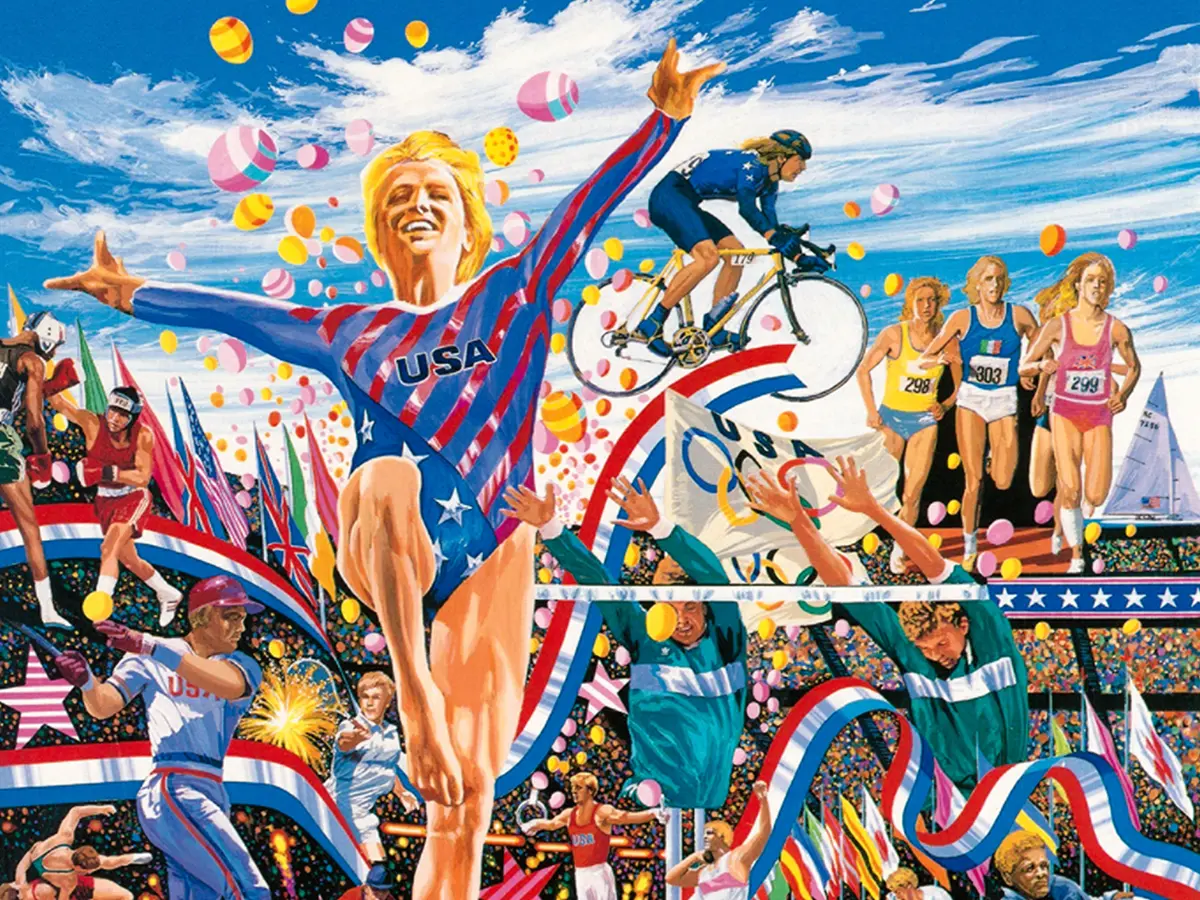 1980年代、ヒロ・ヤマガタはアメリカを拠点に国際的な活動を展開していました。ロサンゼルス五輪の時代背景の中で、スポーツと都市祝祭をテーマにした作品を制作し、オリンピックをテーマにした作品シリーズが始まった時期とされています。